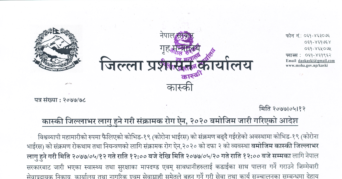 जिल्ला प्रशासन कार्यालयले जारी गरेको सूचनामा कास्की जिल्लाभर मात्र जोर विजोर प्रणाली अनुसार जोर गते जोर नम्बरका र विजोर गते विजोर नम्बरका ट्याक्सी तथा नीजि सवारी साधनहरु बिहान ६ बजेदेखि राति ९ बजेसम्म सञ्चालन गर्न सकिने बताएको छ ।